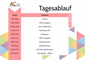 Hier findet ihr, immer brandaktuell, alle Künstler*innen, Referent*innen und Akteur*innen, die euch auf dem Jugendkongress AC26 in Aachen erwarten. Schaut also immer mal wieder vorbei und bleibt so auf dem Laufenden zu unserem stetig wachsenden Programm.