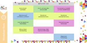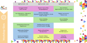 Hier findet ihr alle Angebote, Workshops, Talks und vieles mehr, was euch auf dem Jugendkongress AC26 in Aachen erwartet. Stöbert euch gern durch und plant euren perfekten Tag bei AC26 – dem Jugendkongress. Wir freuen uns auf euch!